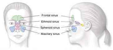 The sinuses are air spaces behind the bones of the upper face, between the eyes and behind the forehead, nose and cheeks. The sinuses are covered with a mucus layer and cells that contain little hairs on their surfaces called cilia. These help trap and push out bacteria and pollutants.